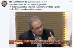 Jair Bolsonaro, nesta sexta-feira, reproduziu o discurso de um radialista gaúcho sobre os impostos dos combustíveis.