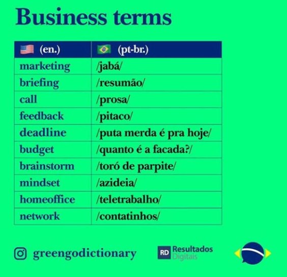 A página @greengodictionary tem 1,2 milhão de seguidores no Instagram trazendo traduções “abrasileiradas” para termos em inglês. Em parceria com a startup catarinense Resultados Digitais, de marketing e vendas, a página fez uma brincadeira e encontrou a versão made in Brazil de algumas expressões corporativas usados em inglês. Qual delas você mais usa?