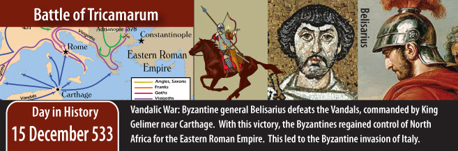 Na Batalha de Ad Decimum, após longos combates e grande estratégia, o general Belisário lidera tropas que derrotam os Vândalos liderados por Galimer em 14 de setembro de 533. Finalmente, na Batalha de Tricamarum, as tropas de Belisário impõem a derrota definitiva dos Vândalos concluída no dia 15 de dezembro de 533.