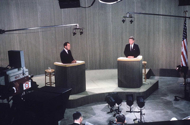 O vice-presidente republicano Richard M. Nixon, à esquerda, debate o senador John F. Kennedy, o candidato presidencial democrata, durante uma transmissão ao vivo de um estúdio de televisão de Nova York do seu quarto debate presidencial em 21 de outubro de 1960.
