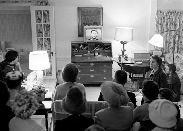 Jacqueline Kennedy, no centro esquerdo, fica em sua sala de estar com um grupo de democratas assistindo o marido na televisão, debatendo assuntos domésticos com o vice-presidente Richard Nixon, em sua casa em Hyannis Port, Massachusetts, em 26 de setembro de 1960.
