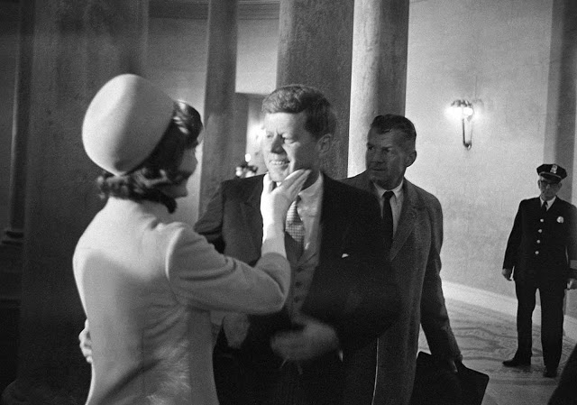 A sra. Jacqueline Kennedy dá uma gargalhada para o marido momentos depois que ele se tornou presidente, em 20 de janeiro de 1961. Esta foto exclusiva do fotógrafo da AP Henry Burroughs foi tirada na rotunda do Capitólio logo após o presidente John F. Kennedy deixar o cargo. stand inaugural.