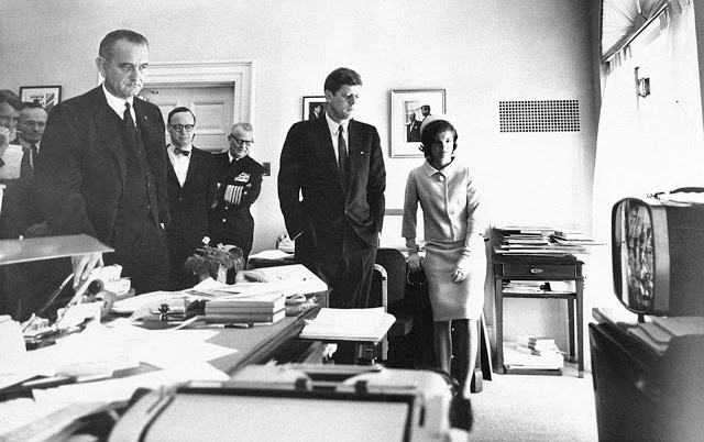 O Presidente Kennedy e a Sra. Jacqueline Kennedy seguem a decolagem e o vôo espacial do astronauta Alan Shepard na televisão. Outros, assistindo do escritório da Casa Branca da secretária do chefe do Executivo em Washington, em 5 de maio de 1961, são da esquerda: Procurador Geral Robert Kennedy; McGeorge Bundy, assistente presidencial; Vice-presidente Lyndon Johnson; Arthur Schlesinger Jr., outro assistente presidencial e Chefe de Operações Navais, Alm. Arleigh Burke.