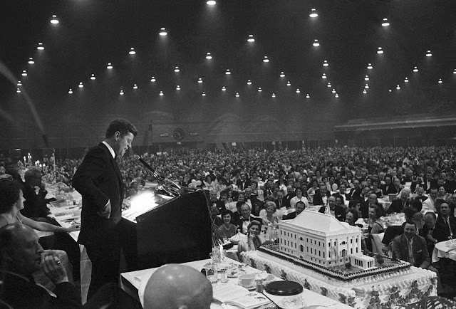 O Presidente Kennedy sorri enquanto faz um comentário de brincadeira aos 6.000 participantes do jantar democrata de US $ 100 por prato em 27 de maio de 1961 no Arsenal da Guarda Nacional de Washington, para ajudá-lo a comemorar seu 44º aniversário. O bolo em primeiro plano pesa 1,5 toneladas e é coberto por uma réplica da Casa Branca.