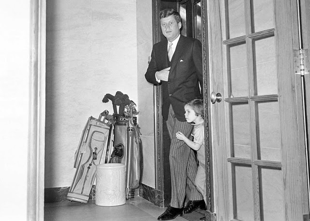 Caroline Kennedy, de três anos, passa por seu pai quando ele sai do elevador no andar térreo da Casa Branca, em 16 de março de 1961, para começar um dia típico às 9h42. O Presidente Kennedy tem uma fita adesiva no corte acima do olho esquerdo, sofreu quando sua cabeça bateu em uma mesa enquanto ele se inclinava para pegar algo para Caroline.