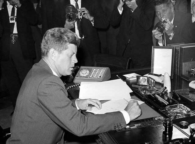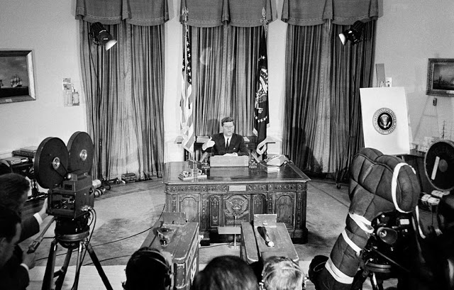 O Presidente Kennedy está cercado por fotógrafos quando se senta em sua mesa na Casa Branca, em 23 de outubro de 1962, logo após assinar uma proclamação presidencial referente à crise do míssil de Cuba.