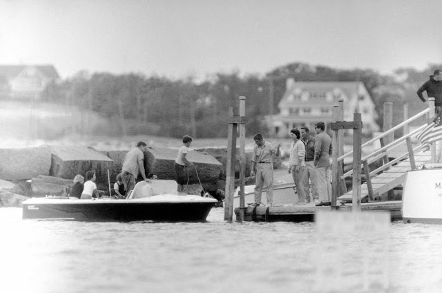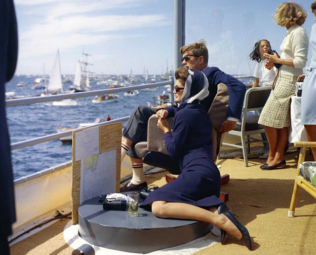 A bordo do USS Joseph P. Kennedy Jr., nomeado após o irmão morto na Segunda Guerra Mundial, o Presidente e a Sra. Kennedy assistiram à primeira corrida da competição da Copa da América de 1962, em Newport, Rhode Island.