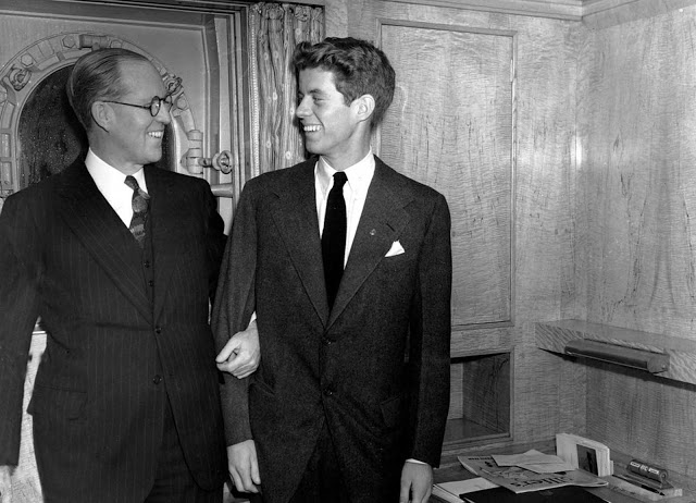 Nesta foto de arquivo de 5 de janeiro de 1938, Joseph P. Kennedy, à esquerda, embaixador dos EUA na Grã-Bretanha, fica com seu filho de 20 anos, John F. Kennedy, em Nova York. Kennedy foi o segundo filho e um dos nove filhos do magnata dos negócios Joseph P. Kennedy. Quando o primeiro filho Joseph Jr. foi morto durante a Segunda Guerra Mundial, John se tornou o herdeiro designado.
