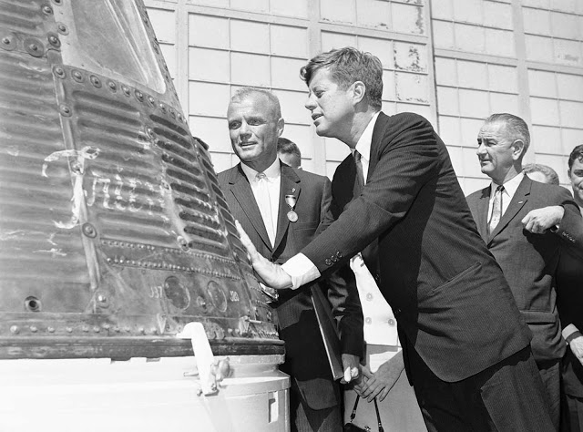 O astronauta John Glenn e o presidente John Kennedy inspecionam a Friendship 7, a cápsula Mercury que Glenn montou em órbita. Kennedy entregou a Glenn a Medalha de Serviço Distinto a 23 de fevereiro de 1962 em Cape Canaveral, Flórida.