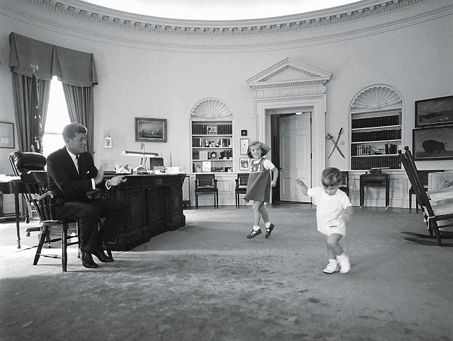 O Presidente Kennedy bate palmas para manter o tempo enquanto seus filhos Caroline e John, Jr. dançam no Salão Oval, em outubro de 1962.