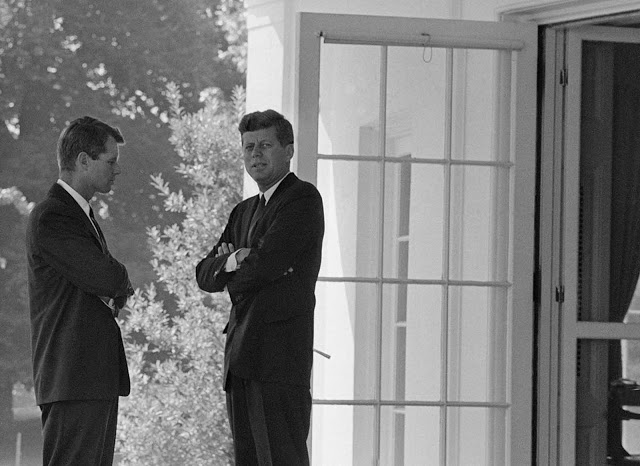 O Presidente Kennedy conversa com seu irmão, o procurador-geral Robert F. Kennedy, na Casa Branca em Washington, Distrito de Columbia, em 1º de outubro de 1962, durante o acúmulo de tensões militares entre os EUA e a União Soviética que se tornaram a crise dos mísseis cubanos mais tarde. mês.