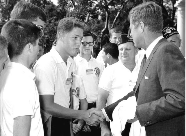 O presidente Kennedy cumprimenta Bill Clinton, de 16 anos, no jardim de rosas da Casa Branca, em um evento da American Legion Boys Nation, em 24 de julho de 1963.