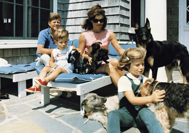 Nesta foto fornecida pela Casa Branca, o Presidente Kennedy, a primeira-dama Jacqueline Kennedy e seus filhos, Caroline e John Jr., com os cães da família em Hyannis Port, Massachusetts, em 14 de agosto de 1963.