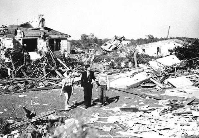 Eleito para o Senado dos EUA em 1952, aqui, o senador John F. Kennedy, acompanhado por Dick Mayer, 15, e Melissa Tyler, 14, de Shrewsbury, Massachusetts, inspeciona os danos causados por tornados em Shrewsbury, em 10 de junho de 1953. Pelo menos 86 ficaram mortos na área pelo furacão, 800 feridos e 2.500 ficaram desabrigados.