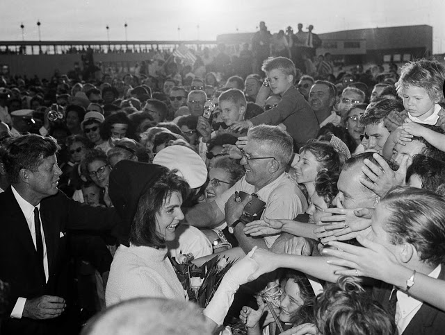Em 21 de novembro de 1963, o Presidente John F. Kennedy e a primeira-dama Jacqueline Kennedy cumprimentam os simpatizantes que alinharam a rampa no Aeroporto Internacional de Houston para recebê-los na cidade do Texas.