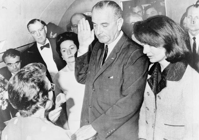 Lyndon B. Johnson é empossado como presidente pela juíza Sarah T. Hughes do Distrito Federal a bordo do avião presidencial, como esposa Lady Bird, ex-primeira-dama Jacqueline Kennedy e outros.