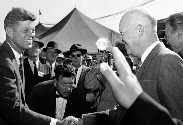 O senador John F. Kennedy cumprimenta o presidente Dwight D. Eisenhower em sua chegada para festividades no Concurso Nacional de Colheita de Milho, perto de Cedar Rapids, Iowa, em 17 de outubro de 1958.