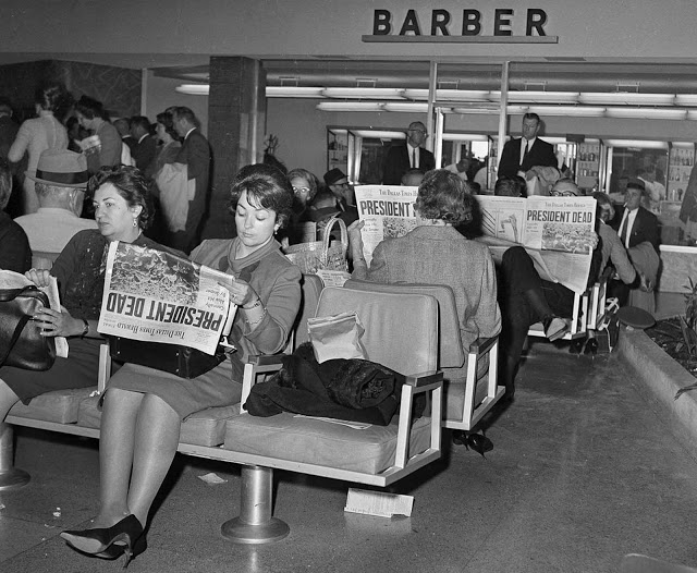 As pessoas que aguardam vôos de Dallas em Love Field leem as notícias do assassinato do presidente John F. Kennedy no jornal Dallas Times Herald, em 23 de novembro de 1963.