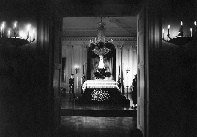 O caixão de Kennedy, deitado no estado, na sala leste da casa Branca, antes de ser transferido para a rotunda do Capitólio.