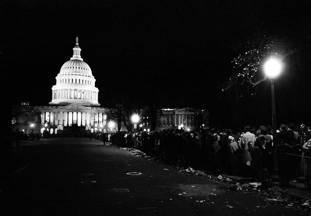 Com o iluminado Capitólio dos EUA em segundo plano, os enlutados formam uma fila interminável que durou a noite toda, para prestar homenagem ao presidente morto John F. Kennedy, em Washington, Distrito de Columbia, em 24 de novembro de 1963.