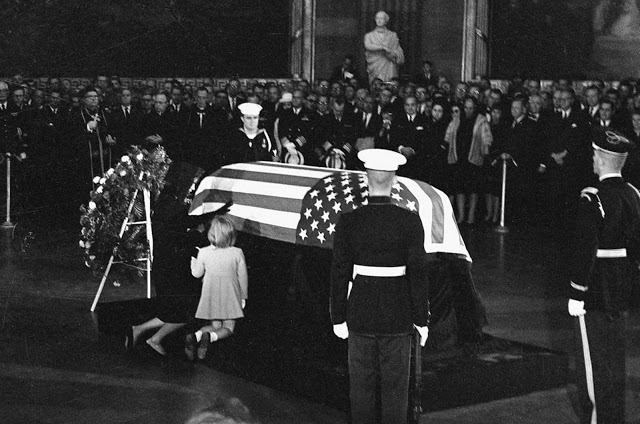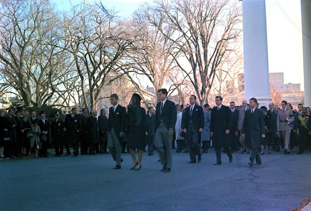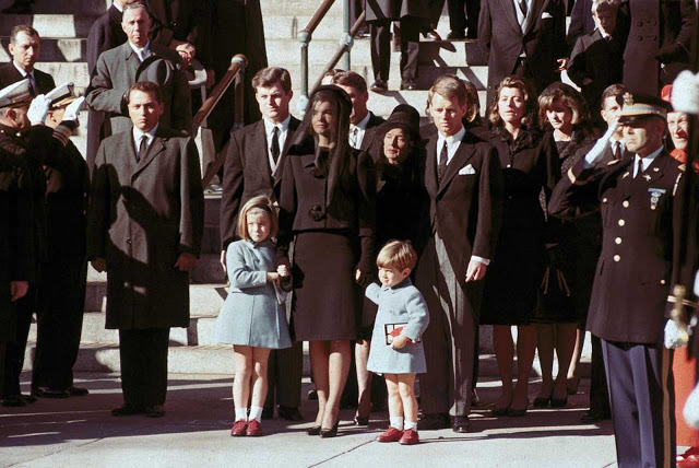 A Primeira Família assiste a procissão fúnebre de John F. Kennedy em Washington em 25 de novembro de 1963, três dias após o assassinato do presidente em Dallas. A viúva Jacqueline Kennedy, ao centro, a filha Caroline Kennedy, à esquerda, e o filho John Jr., são acompanhados pelos irmãos do falecido presidente, o senador Edward Kennedy, à esquerda, e o procurador-geral Robert Kennedy.