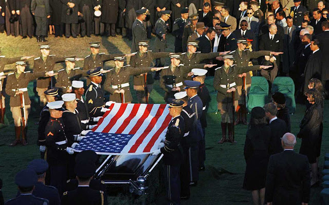 Um guarda de honra irlandês de cadetes, com os braços estendidos, permanece em formação quando a bandeira dos EUA é erguida do caixão do presidente John F. Kennedy durante seus serviços funerários no Cemitério Nacional de Arlington, em Arlington, Virgínia, em 25 de novembro de 1963. Os cadetes, Soldados de 18 e 19 anos de idade, haviam sido levados de seus quartéis remotos no Condado de Kildare no dia anterior e foram levados de avião para os EUA para realizar um treinamento cerimonial especial no funeral do presidente morto. Ele ficou cativado pela broca quando a viu realizar em Dublin meses antes.