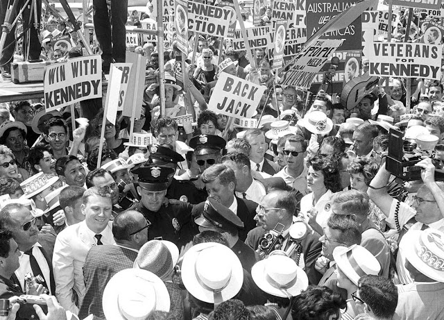 O senador John F. Kennedy é assediado por simpatizantes que carregam bandeiras de Kennedy em sua chegada ao Aeroporto Internacional de Los Angeles, em 9 de julho de 1960, para liderar pessoalmente sua campanha pela indicação presidencial democrata.