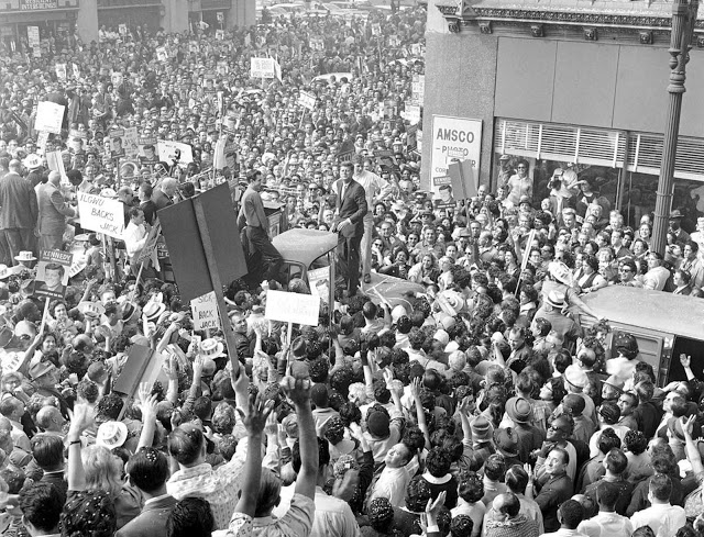 O senador John F. Kennedy, (canto inferior direito), sorri alegremente quando apoiadores aplaudem o candidato presidencial democrata em Minneapolis, no dia 1º de outubro. Kennedy estava saindo de seu hotel para um comício e estava cercado por uma grande multidão de partidários em 2 de outubro de 1960. Eles acenaram com bandeiras e atiraram confetes e gritaram com entusiasmo. Entre 18.000 e 20.000 participaram do comício e milhares foram recusados.