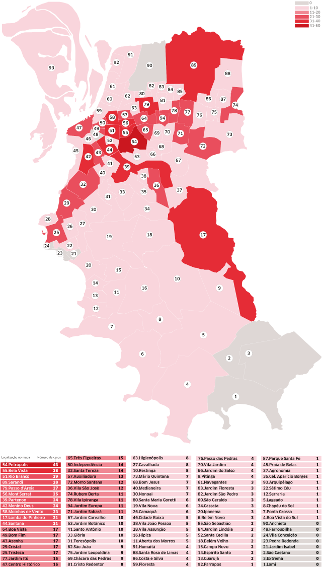Apesar de recomendada por especialistas ouvidos recentemente pelo CP, a transparência com relação à distribuição territorial do vírus em Porto Alegre não vinha ocorrendo. Além do receio de um estigma social, a Secretaria Municipal de Saúde (SMS) alega que aguardava a finalização da ferramenta de visualização dos dados. De acordo com a pasta, a versão final do mapa evita o pânico com determinadas regiões da cidade porque não utiliza mapa de calor e preserva informações como ruas específicas e o endereço das pessoas infectadas.