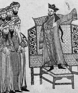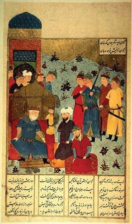 Maḥmūd Ghāzān recebendo os nobres de Khorāsān, detalhe de uma iluminação do manuscrito mongol Jāmiʿ at-tawārīkh, c. 1307; na Biblioteca da Universidade de Edimburgo (MS. Or.20)Cortesia da Biblioteca da Universidade de Edimburgo, Escócia