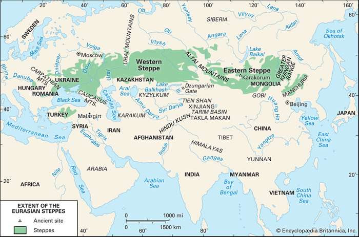 Extensão das estepes da Eurásia.Encyclopædia Britannica, Inc.