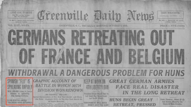 A imagem a seguir mostra como a pandemia dividiu atenções com a guerra. A notícia sobre o avanço da doença no mundo fica abaixo dos movimentos militares na Europa no jornal americano Greenville Daily News, em 3 de outubro de 1918: