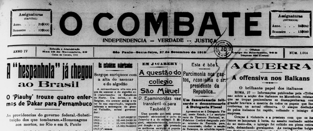 A sociedade brasileira demorou para perceber a gravidade da pandemia da gripe espanhola. Houve vítimas na missão de médicos do país que serviu na 1ª Guerra Mundial. Em 27 de setembro de 1918, o jornal paulistano O Combate anunciava a chegada do vírus: