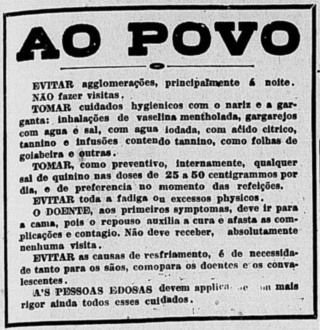 Também dava dicas de higiene, recomendava que aglomerações fossem evitadas e outras providências. Eis a forma como foi publicado no Estadão: