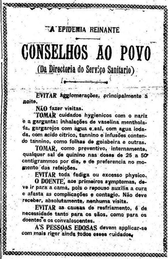 Há 102 anos, quando outra pandemia assustava a humanidade, a imprensa publicava conselhos para que a população se cuidasse. A doença da época era a gripe espanhola, que teve entre as vítimas o presidente eleito Rodrigues Alves.