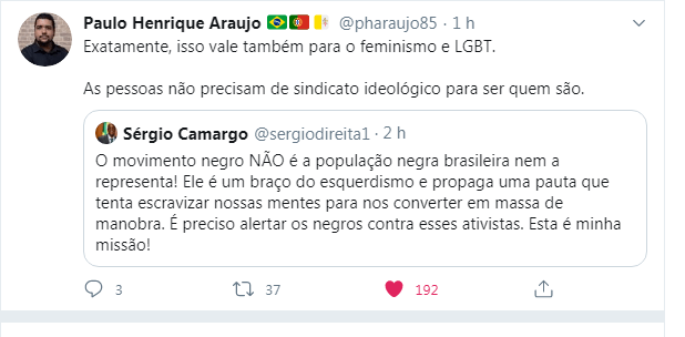 RS Notícias: O movimento negro NÃO representa a população negra brasileira Lucio Borges Sem categoria 7 de junho de 20207 de junho de 2020 1 minuto Fonte: https://twitter.com/pharaujo85/status/1269655813951545345?cn=ZmxleGlibGVfcmVjcw%3D%3D&refsrc=email Fonte: RS Notícias: O movimento negro NÃO representa a população negra brasileira Compartilhe isso: Compartilhar no X(abre em nova janela) 18+ Compartilhar no Facebook(abre em nova janela) Facebook Curtir Carregando... Relacionado Publicado por Lucio Borges Editor do site RS Notícias. Ver todos os posts de Lucio Borges Publicado 7 de junho de 20207 de junho de 2020