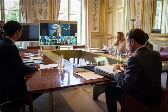 Macron, presidente francês, em reunião nesta sexta-feira: expectativa de pacote europeu fez bolsas abrirem em alta | Eliot Blondet/Pool via REUTERS