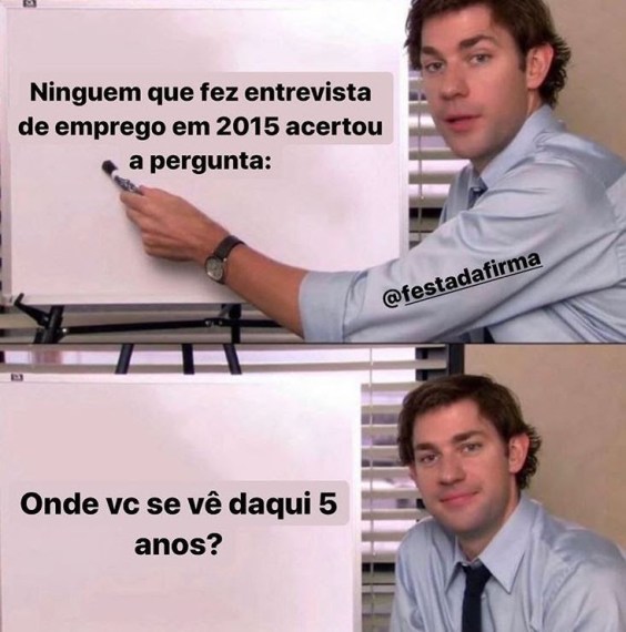 O perfil @festadafirmano Instagram, que faz piadas diárias com o cotidiano do mundo corporativo, fez uma brincadeira com as perguntas sobre o futuro em entrevistas de emprego. Em meio à pandemia, não se pode dizer que alguém acertou as previsões para 2020.