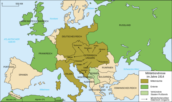 Por volta de 1914, a Europa foi dividida em dois blocos: os poderes do eixo (poderes centrais), com a Alemanha, Áustria-Hungria, Turquia, Bulgária e Itália, de um lado e do outro “Entente”com França, Rússia, Grã-Bretanha, Portugal e muitos outros países. A Áustria formou a Tríplice Aliança com a Itália e a Alemanha. Mais tarde, a Itália se juntou aos Aliados porque prometeu ao país do sul do Tirol.