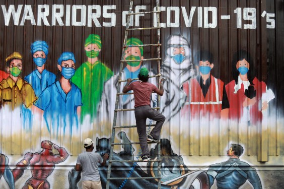 Mural para profissionais de saúde em Nova Delhi, na Índia: mundo teve maior número de casos diários desde o começo da pandemia | REUTERS/Anushree Fadnavis