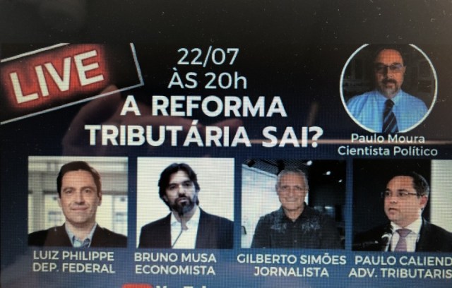 Dia 21/7 o governo entrega ao Congresso sua proposta de Reforma Tributária. Amanhã, dia 22 Paulo Moura reunirá numa live no seu Canal do YouTube: o deputado federal Luiz Philippe, Gilberto Simões Pires (jornalista e Adm. de Empresas), Bruno Musa (economista e diretor da Acqua Investimentos) e Paulo Caliendo (advogado tributarista). https://www.youtube.com/watch?v=q7utyN53DaA