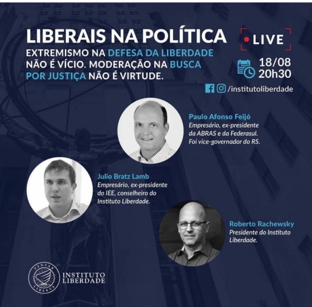 RS Notícias: LIVE – LIBERAIS NA POLÍTICA Lucio Borges Sem categoria 18 de agosto de 2020 1 minuto Live de hoje do Instituto Liberal – participação de Paulo Feijó, Julio Lamb e Roberto Rachewsky . /@institutoliberdade Pontocritico.com Fonte: RS Notícias: LIVE – LIBERAIS NA POLÍTICA Compartilhe isso: Compartilhar no X(abre em nova janela) 18+ Compartilhar no Facebook(abre em nova janela) Facebook Curtir Carregando... Relacionado Publicado por Lucio Borges Editor do site RS Notícias. Ver todos os posts de Lucio Borges Publicado 18 de agosto de 2020