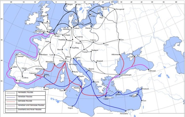 Um mapa que mostra as rotas comerciais do final da Idade Média por terra e mar na Europa e na Ásia Ocidental. Lampman, Wikimedia Commons