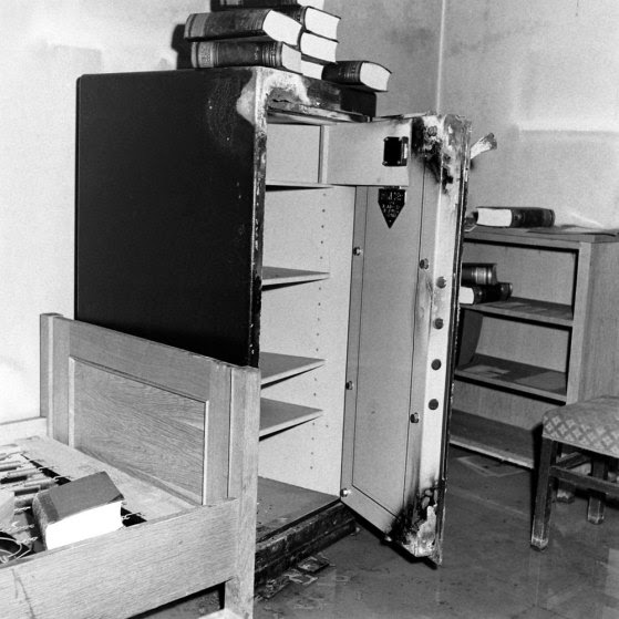 Este é um cofre que foi encontrado dentro do bunker de Hitler. Obviamente, foi aberto e saqueado após a batalha.