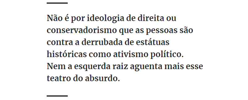 Se você nem entendeu mas já está com a paciência cheia dos derrubadores de estátua, fique tranquilo. Há pessoas, como eu, que sentiam isso e se perguntavam: será que eu vivo numa bolha e não estou entendendo a importância deste movimento mundial? Trago para você aqui a certeza de que não é por estar em bolha, ser de direita ou conservador que você tem essa impressão de que derrubar estátua é um belo de um serviço de inutilidade pública. Sua impressão confere com a realidade.
