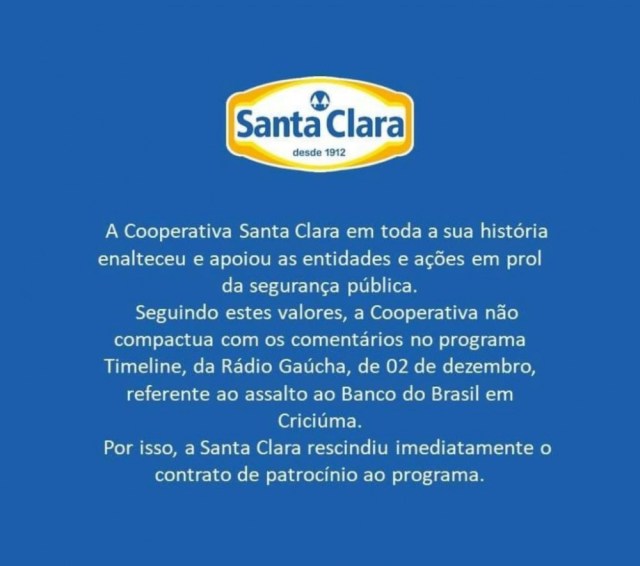 Pois, tão logo o programa chegou ao seu final, a UNICRED, que a exemplo do Banco do Brasil também é uma INSTITUIÇÃO FINANCEIRA, emitiu a seguinte NOTA: – Diante da repercussão negativa sobre o conteúdo divulgado no programa TimeLine, da Rádio Gaúcha, onde os jornalistas Kelly Matos e David Coimbra comentam os fatos do assalto a uma agência do Banco do Brasil, definimos rescindir o contrato de patrocínio, que deve cumprir o aviso prévio de 30 dias a partir da data do cancelamento.