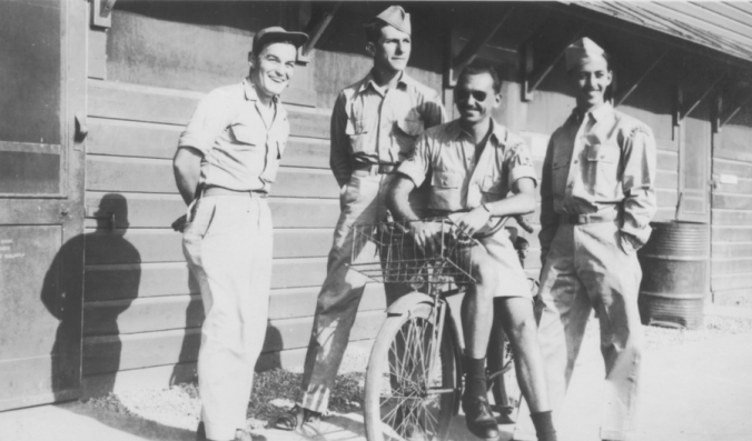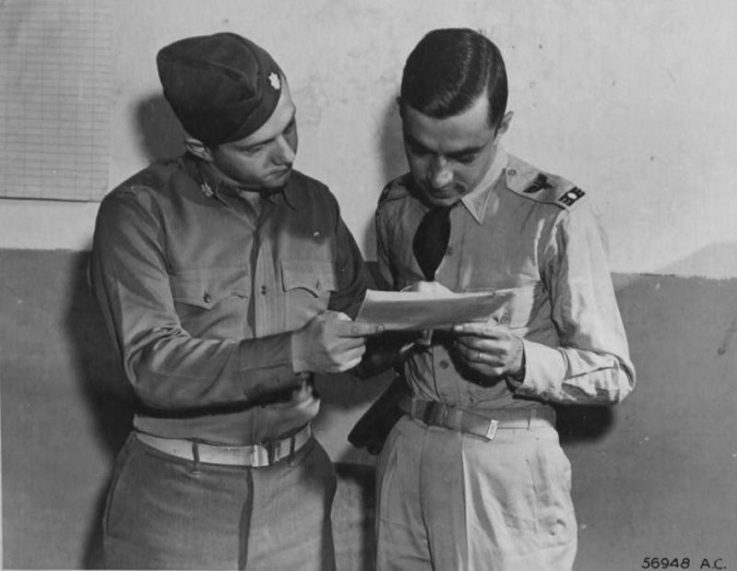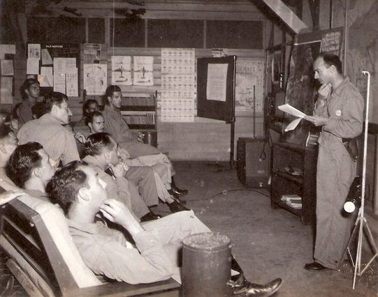 Acima: O então Tenente Rui Moreira Lima (primeiro sentado no canto) e Tenente José Meira de Vasconcelos (sentado, terceiro do canto para dirigir.) Recebem instrução para missão na Itália ACERVO BRIGADEIRO MEIRA