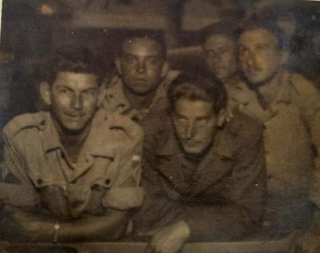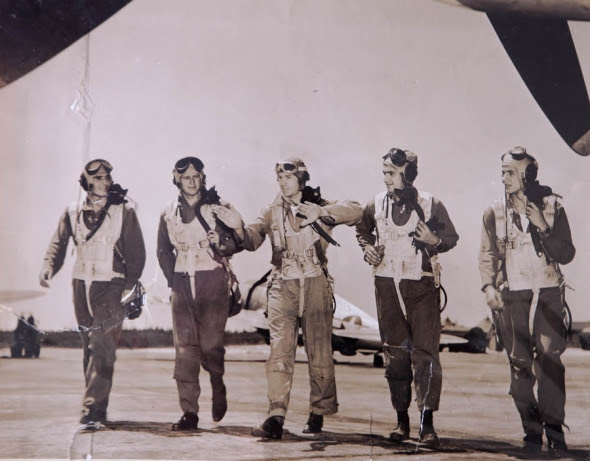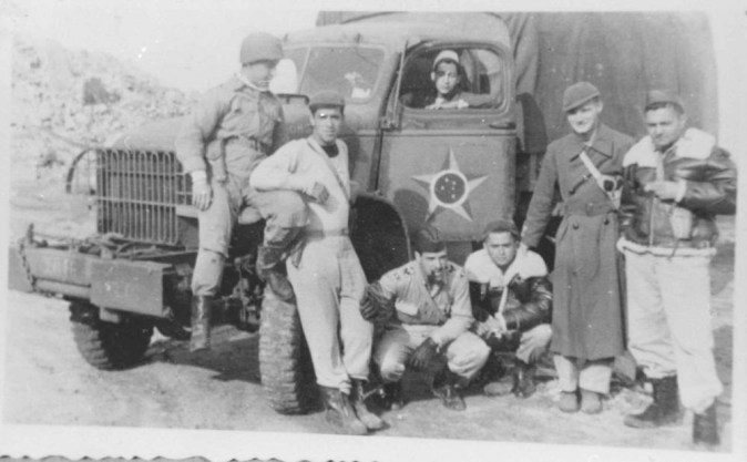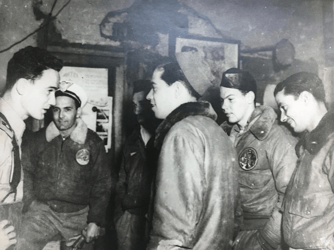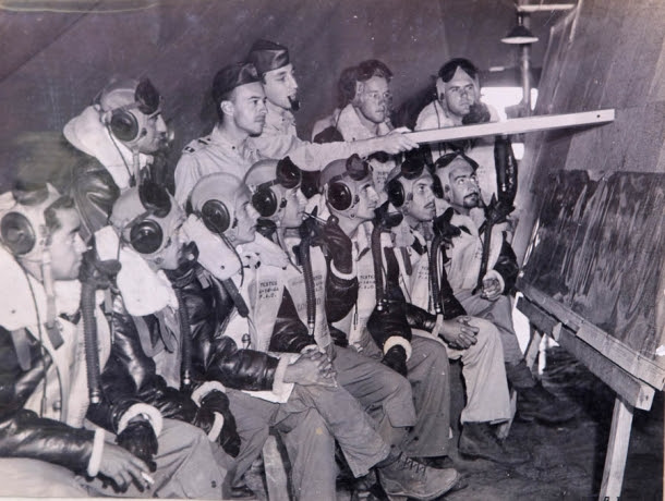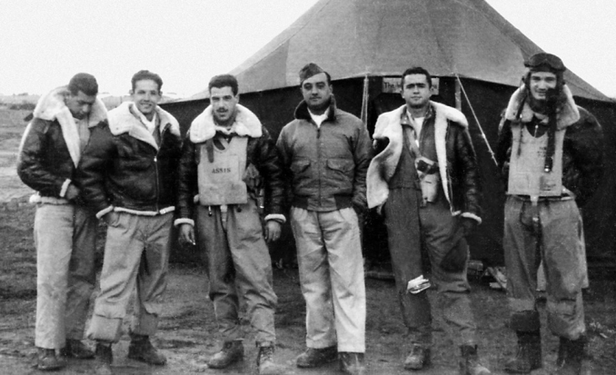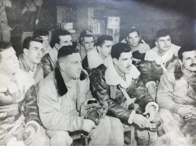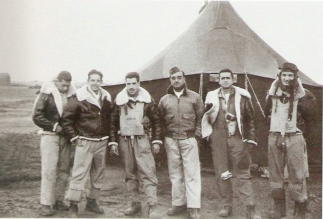 Abaixo: Pilotos brasileiros saindo de Suffolk, base dos Estados Unidos com destino à Itália. Pilotos: (esq / dir) Goulart, Fortunato, Lima Mendes, Coelho, Meira e Neiva.