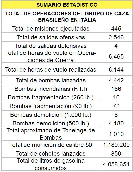 Essa é a história da atuação da “Força Aérea Brasileira” na Campanha Italiana. O Grupo Brasileiro de Caça realizou 445 missões no local, com um total de 2.546 saídas de aeronaves e 5.465 horas de vôo em operações de guerra. Destruiu 1.304 veículos motorizados, 13 locomotivas, 250 vagões, 8 vagões blindados, 25 pontes ferroviárias e rodoviárias e 31 depósitos de combustível e munições. A “Força Aérea Brasileira”, em sua primeira experiência de guerra fora do território brasileiro, enviou à Itália uma Unidade Aérea, o 1º Grupo de Caças, cujo pessoal respondeu às maiores esperanças que se podia ter sobre sua bravura, senso de realização. de dever, espírito de sacrifício e coragem profissional.