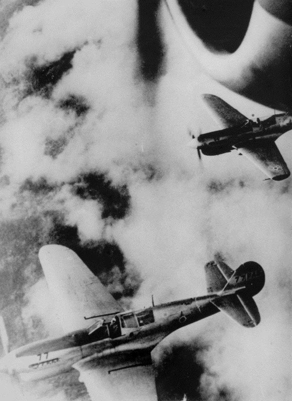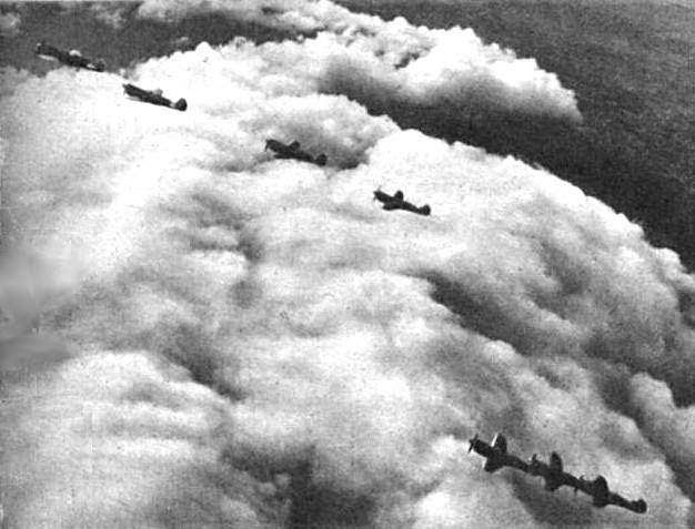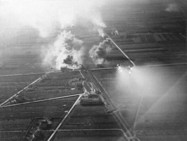![]() Acima: Bombardeio realizado pela Força Aérea Brasileira (FAB) no norte da Itália. Na foto é possível ver os foguetes disparados pelo P-47 em direção ao solo REPRODUÇÃO / FAB